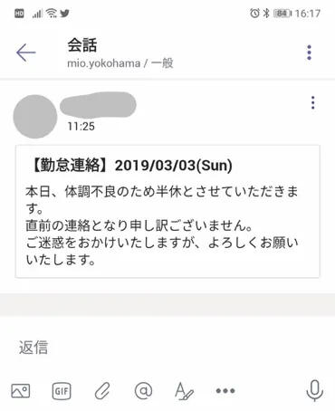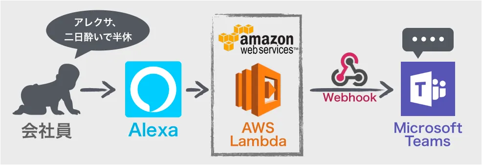 アレクサが休暇区分(全休/半休)と理由を取得し、Lambdaに渡します。 そして、Lambdaでチャットのメッセージを生成し、Microsoft TeamsのWebhookを用いて投稿します。 例えば、「アレクサ、勤怠連絡、お腹痛いから半休」のように言えば、下記のように勤怠連絡がチャンネルに投稿されます。
