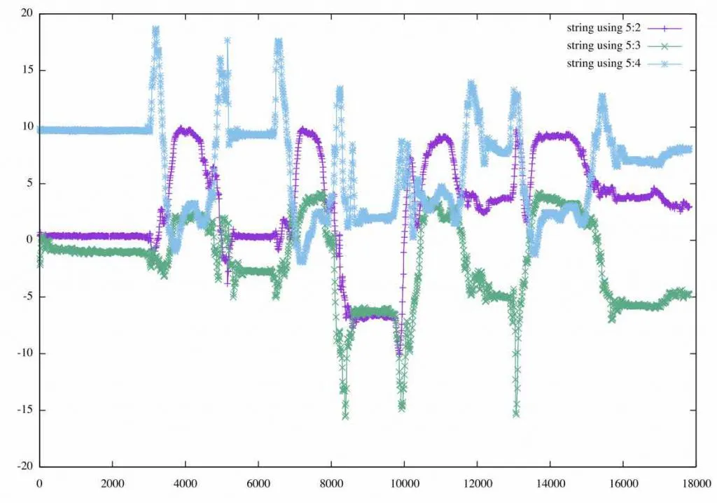 plot string using 5:2 with linespoints title "X axis" , string using 5:3 with linespoints title "Y axis" , string using 5:4 with linespoints title "Z axis" ;