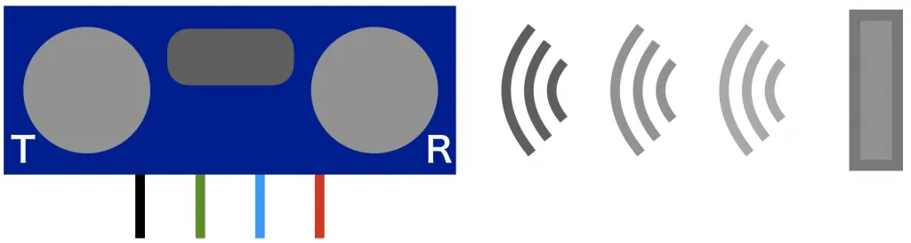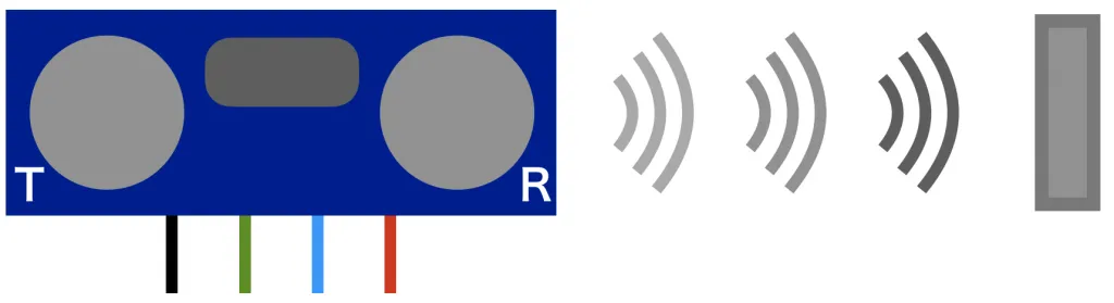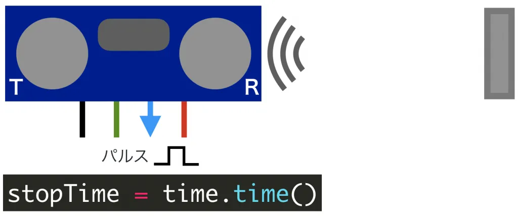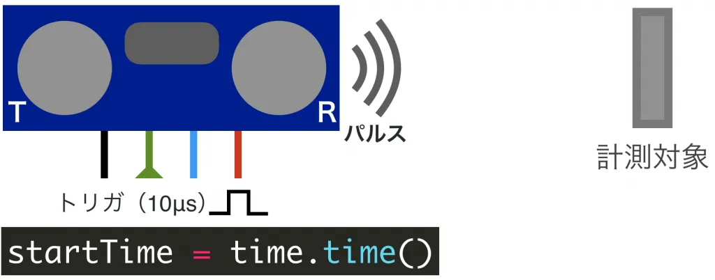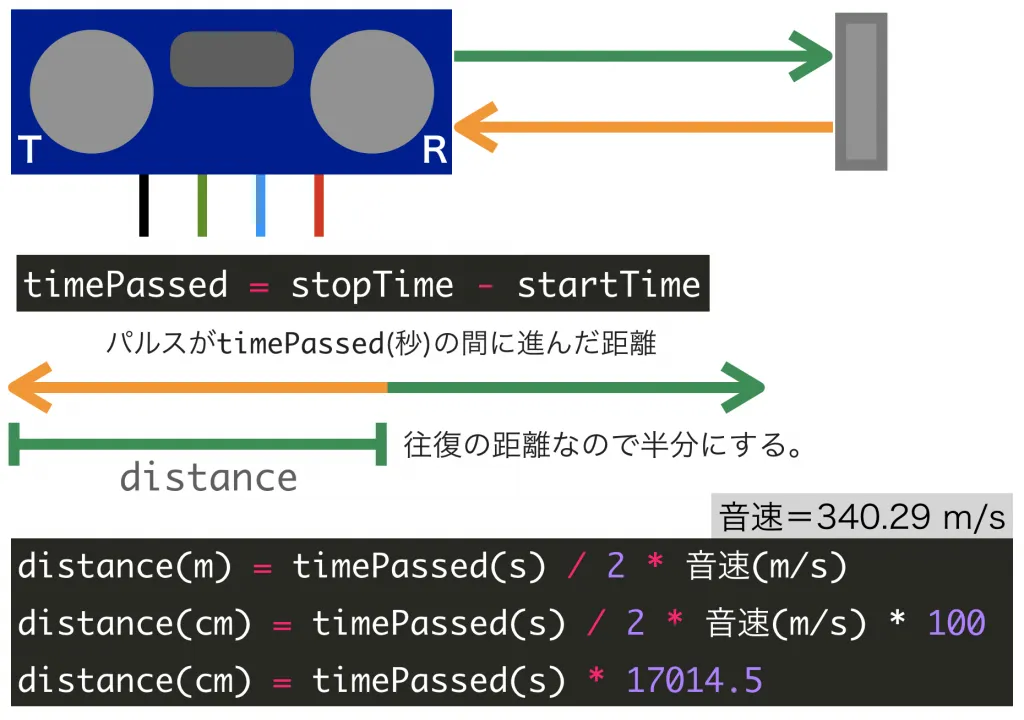 超音波距離センサの仕組みは、超音波を計測対象に発射し、反射が返ってくるまでに要した時間と、音の進むスピードから距離を計算し求めるものです。距離測定の手順を示します。