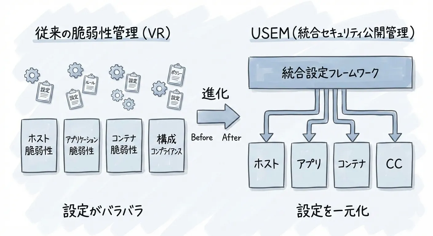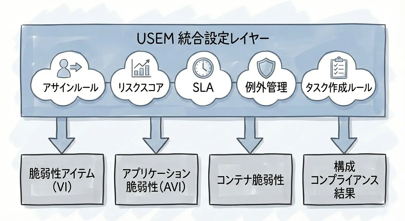 注意点として、設定は一元化されますが、テーブル(データ層)が統合されるわけではありません。 脆弱性アイテム(VI)、アプリケーション脆弱性アイテム(AVI)、コンテナ脆弱性アイテム、CCテスト結果などの各テーブルはそのまま維持されます。USEMは、これら既存のデータの上に新しい「管理・構成レイヤー」を被せる構造をとっています。
