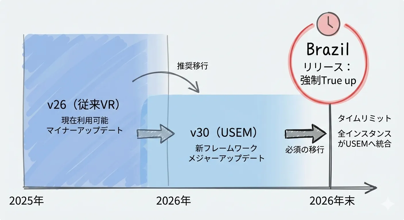 2026年末頃に予定されているBrazilリリースでは、全インスタンスがUSEMへ強制統合(True up)される計画です。このタイムリミットを顧客に明示し、早期のロードマップ提案と予算確保を支援する必要があります。