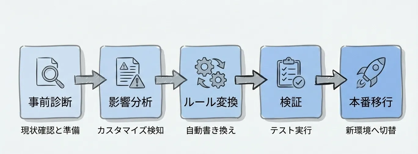 ルールの自動変換: 既存の割り当てルール等を、新フレームワーク用に自動で書き換え。