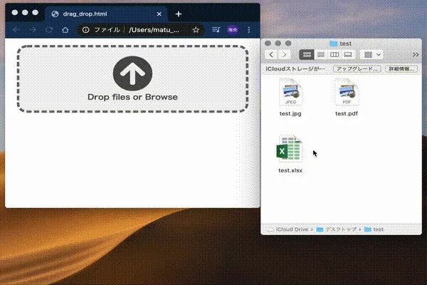 const drag_drop_app = new Vue({ el: “#drag_drop_app”, data: { isEnter: false, files: [] }, methods: { dragEnter() { this.isEnter = true; }, dragLeave() { this.isEnter = false; }, dragOver() { }, dropFile() { this.files.push(…event.dataTransfer.files) this.isEnter = false; }, deleteFile(index) { this.files.splice(index, 1) }, upload: function () { // FormData を利用して File を POST する let formData = new FormData(); formData.append(‘files’, this.uploadFile); let config = { headers: { ‘content-type’: ‘multipart/form-data’ } }; axios .post(‘yourUploadUrl’, formData, config) .then(function (response) { }) .catch(function (error) { }) }, sendFile() { this.files.forEach(file => { let form = new FormData() form.append(‘file’, file) axios.post(‘url’, form).then(response => { console.log(response.data) }).catch(error => { console.log(error) }) }) }, btnclick() { this.$refs.input.click(); }, onFileChange(e) { let files = e.target.files || e.dataTransfer.files; this.files.push(…files) console.log(files) } } })