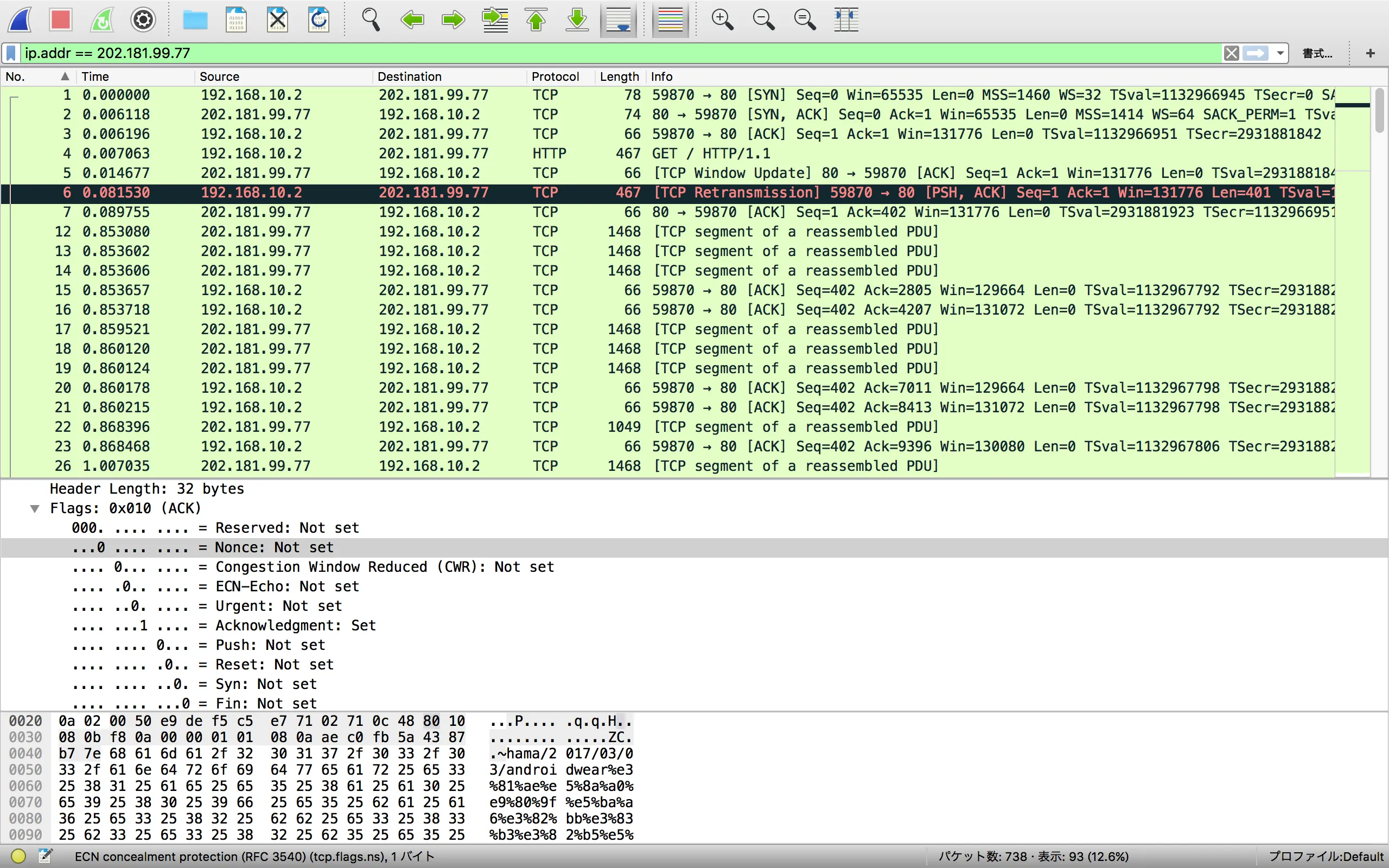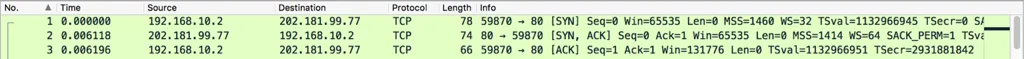 Wiresharkでは関係のない通信のパケットもキャプチャして見辛いので、今回はサーバのアドレス(202.181.99.777)との通信のみを表示するように、表示フィルタにip.addr == 202.181.99.77 を設定しています。 これがキャプチャしたパケットです。 3ウェイハンドシェイクは冒頭の3パケットで行われています。