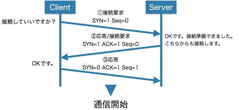 TCPでは通信をするために、コネクションを確立するコネクション型通信をします。 コネクション確立するために行うのが、3ウェイハンドシェイクです。 これは、コネクション確立要求パケットとそれに対する応答確認パケットのやり取りを3回行うことから名付けられた方法です。 コネクション確立要求パケットをSYN(Synchronize)、確認応答パケットをACK(Acknowledge)といいます。 コネクションが確立すると、クライアントとサーバの間にVC(virtual circuit)が作られ、お互いは下位層通信プロトコルを意識せずに、VCにデータを投入するだけで通信ができます。